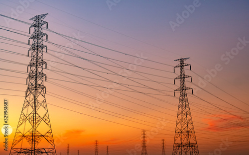Silhouette high voltage electric pylon and electrical wire with purple and red sunset sky. Electricity poles at sunset. Power and energy concept. High voltage grid tower with wire cable. Steel pylons.