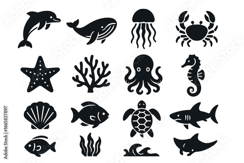 Silhouette icons of marine life: dolphins, whales, jellyfish, crabs, starfish