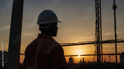 Silhouette Illustration of a Project Supervisor Wearing a Safety Helmet Looking at an Infrastructure Building Project.