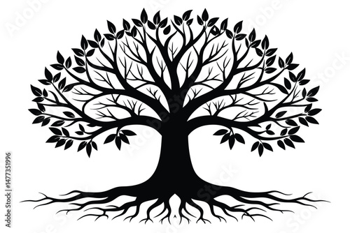 Silhouette Illustration of a Sprawling Tree with Roots and Leaves Vector Graphic Art