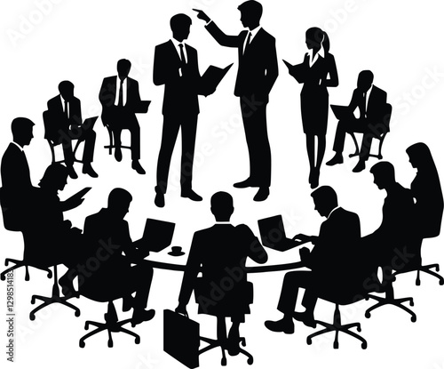 Silhouette illustration of business professionals interacting in a modern office setting. Some are listening, capturing a collaborative and dynamic meeting atmosphere