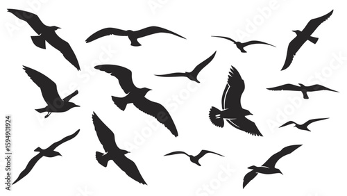 Silhouette illustration showing a flock of birds flying in different directions against a white background