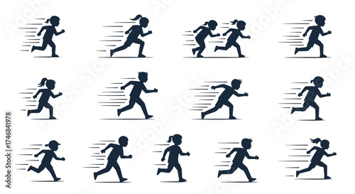 Silhouette illustrations of children running with motion lines, depicting speed and activity.