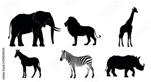 Silhouette illustrations of six african animals including an elephant, lion, giraffe, zebra, rhino, and horse depicted in black with distinct outlines.