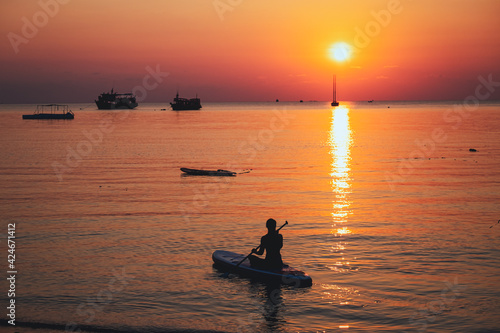 Silhouette image of a young woman sitting on stand up paddle board in the sea before sunset