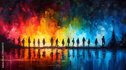silhouette image of art paint illustration of many people on a colorful fantasy background