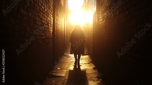 Silhouette in Alleyway Mysterious Figure Walks Towards the Bright Light at the End of Tunnel