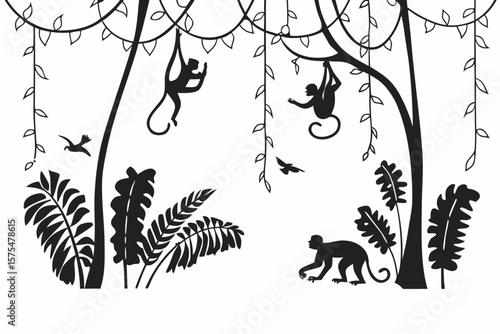 Silhouette jungle scene with vines and diverse animals in vibrant colors
