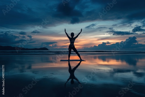 Silhouette lady practice yoga for healthy on the beach with twilight sky background , ai