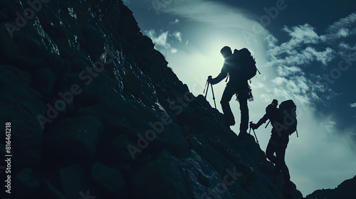silhouette male and female hikers climbing up mountain cliff helps and team work concept : Generative AI