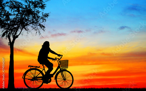 Silhouette man and bike relaxing on blurry sunrise sky background.