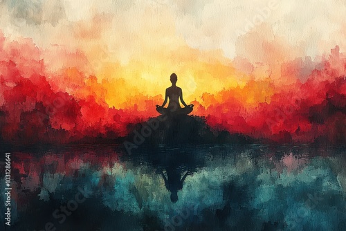 Silhouette meditating at sunrise with vibrant watercolor sky and peaceful reflection on calm water surface, symbolizing balance and tranquility.