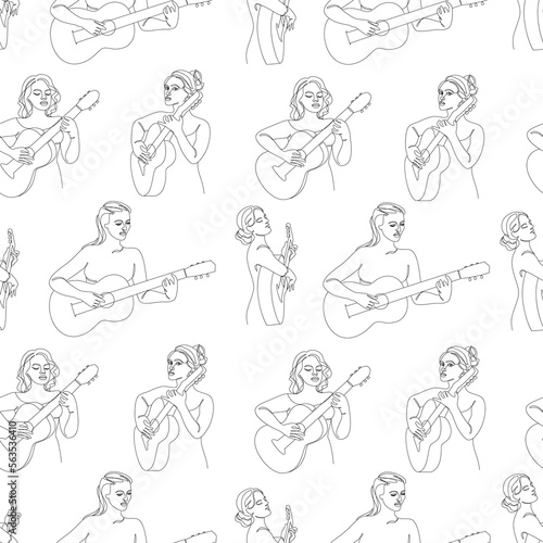 Silhouette of a beautiful woman playing the guitar in continuous modern single line style. Guitarist. Decor sketches, posters, stickers, logo. Set of vector illustrations, seamless pattern.