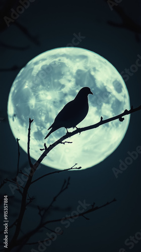 Silhouette of a bird perched on a branch against a bright full moon at night.
