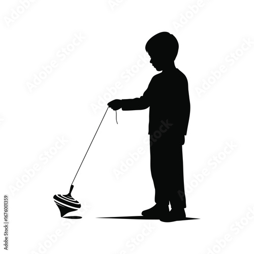 Silhouette of a boy playing with a spinning top classic childrens game illustration