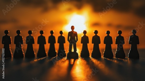 Silhouette of a Business Leader Standing Out Amongst Team Members Against a Stunning Golden Sunset Background, Symbolizing Leadership and Inspiration
