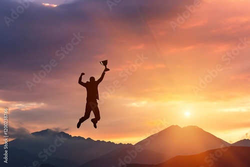 Silhouette of a businessman jumps holding a trophy on top mountain with light sunset. concept of a successful business or determination to lead the organization to success.