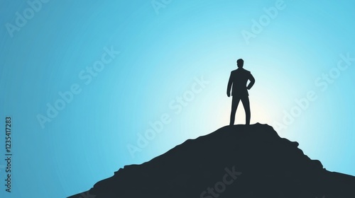 Silhouette of a Businessman Triumphantly Standing on a Mountain Peak
