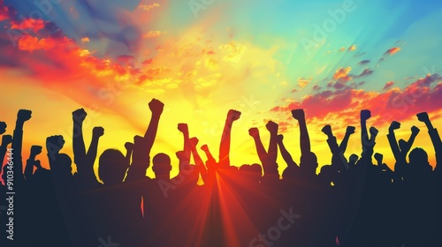 Silhouette of a cheering crowd in victory.