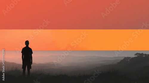 Silhouette of a Child Against a Sunset Sky Over Rolling Hills in a Serene Landscape
