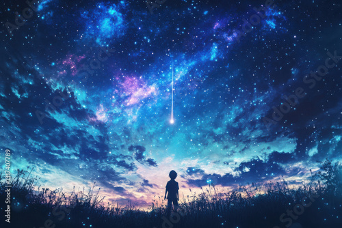 Silhouette of a child gazing at a vibrant night sky with a shooting star, surrounded by a breathtaking cosmic landscape of blues and purples.
