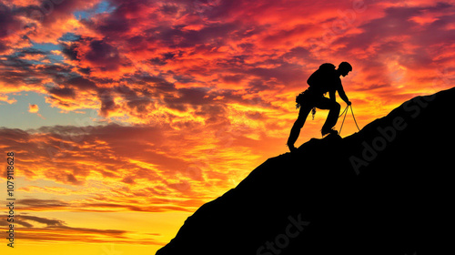 Silhouette of a climber triumphing on a mountain peak during a vibrant sunset sky