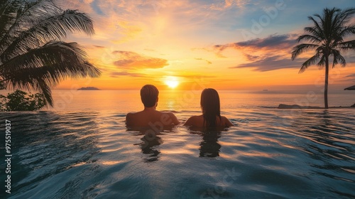 Silhouette of a couple in a pool at sunset, enjoying the view of the ocean.