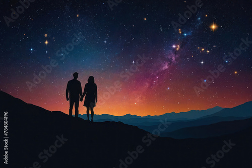 Silhouette of a couple in love holding hands against the backdrop of a multi-colored starry sky and mountains. Stars and galaxies.