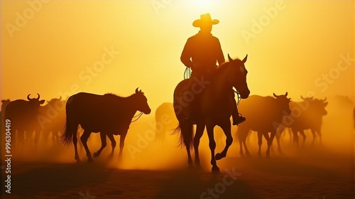 Silhouette of a Cowboy on Horseback Managing a Herd of Cattle On a Dusty Plains During Sunset