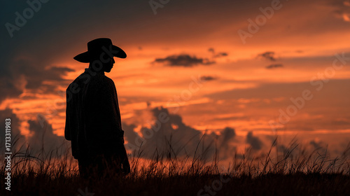 Silhouette of a cowboy standing in a field during a vibrant sunset.