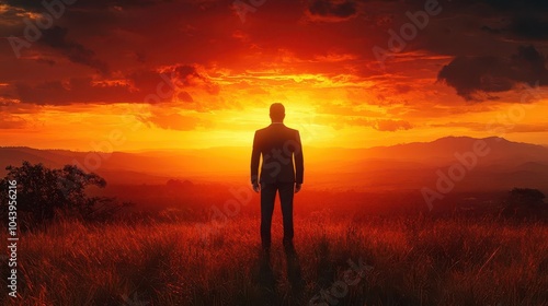 silhouette of a determined entrepreneur standing against a sunset backdrop embodying ambition and perseverance with vibrant colors blending into the horizon