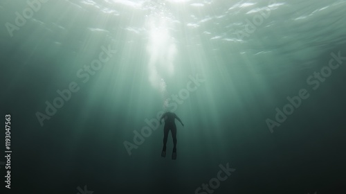 Silhouette of a diver underwater, sunbeams illuminating the scene.