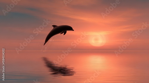 Silhouette of a dolphin leaping at sunset.