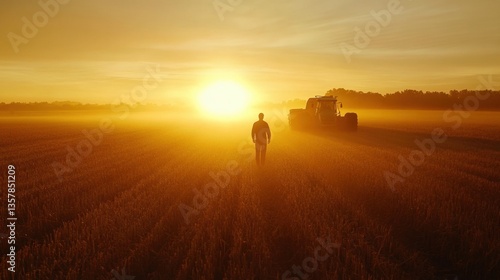 Silhouette of a farmer in a golden field during sunrise, surrounded by soft light and a sense of tranquility and hope Generative AI