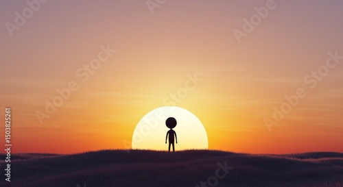 Silhouette of a figure standing before a rising sun in a serene landscape