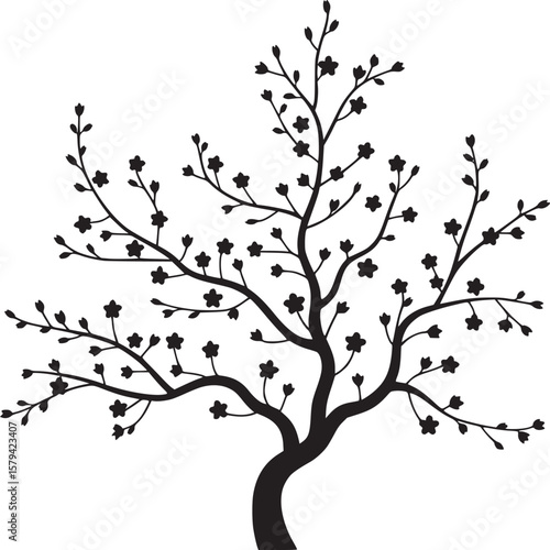 Silhouette of a flowering tree with small blossoms and thin branches against a white background