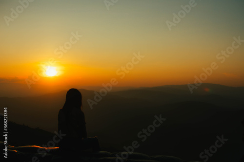 Silhouette of a girl sitting on a cliff side looking at the sunset. Beautiful sunset background.