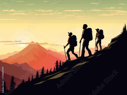 Silhouette of a group of hikers climbing a mountain with a beautiful view of the mountains as a background.