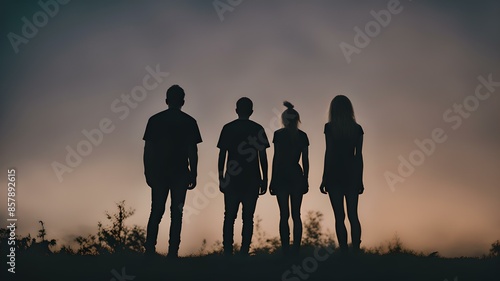 silhouette of a group of teenagers looking at the sunset, cinematic photo of a group band