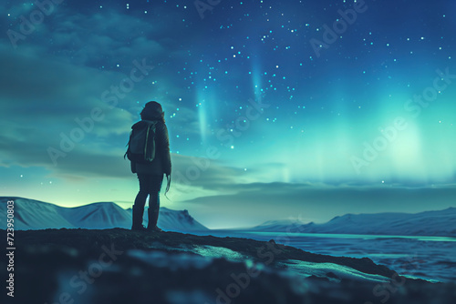 Silhouette of a hiker admiring the view of aurora borealis in beautiful Icelandic nature. Sky with stars and green polar lights. Northern lights.