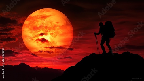 Silhouette of a Hiker on a Mountain Peak at Sunset with a Giant Red Moon