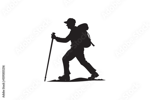 Silhouette of a hiker with a backpack and trekking poles walking on a hill isolated on a white background perfect for adventure and outdoor themed Art & Illustration