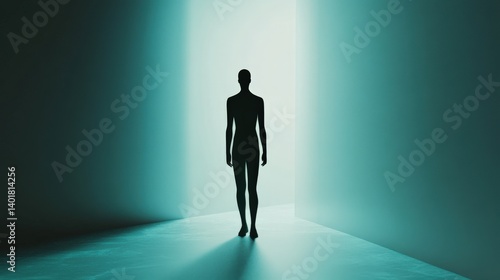 Silhouette of a human figure walking through a glowing doorway with a serene background ambiance