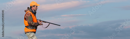 Silhouette of a hunter with a gun against the sun, an ambush for ducks.
