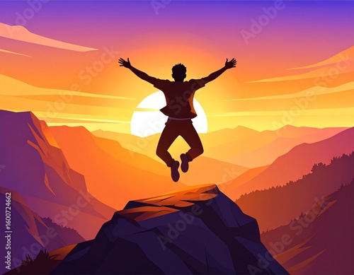 Silhouette of a joyful person jumping on a mountain peak at sunset, arms raised.