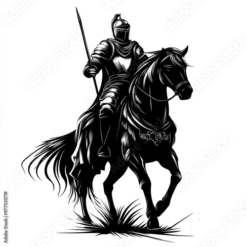 Silhouette of a knight on a horse, in black color only, full-body, isolated on a white background.