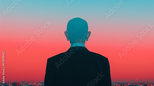Silhouette of a large city with a double exposure of an elderly businessman, capturing the essence of experience and urban hustle. Clean and Clear Color, Realistic Photo, , Minimalism,