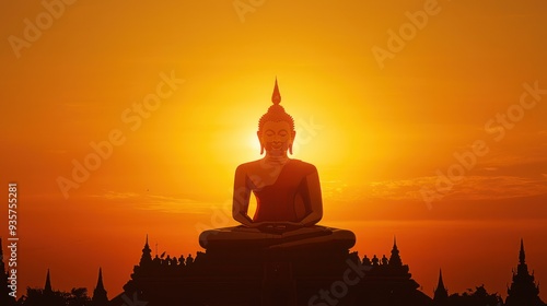 silhouette of a large golden buddha in the temperature zone high resolution photo yellow orange sharp focus colorful shaped canvas religious art serene atmosphere ancient Thai architecture looks towar