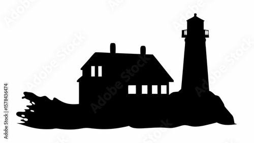 Silhouette of a lighthouse with a building on a rocky shore against a white background landscape view