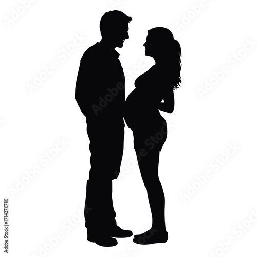 Silhouette of a man and a pregnant woman standing face to face looking at each other in black and white